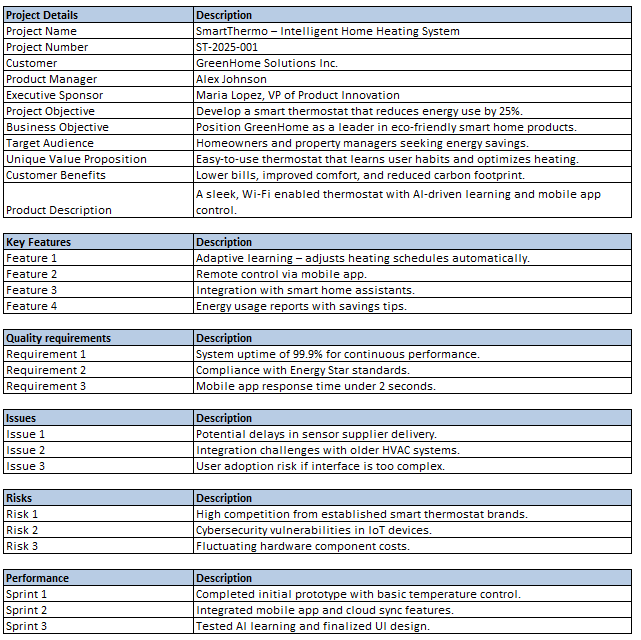 A product datasheet is a concise, one-page document that communicates the most important information about a product. It is not a detailed technical specification. Instead, it highlights what the product is, who it is for, and why it matters. In Agile projects, the datasheet is an effective way to align teams and stakeholders around a clear picture of the product. It serves as both a reference and a communication tool, helping people outside the team quickly understand the product’s purpose and benefits.