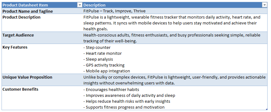 Imagine an online learning platform. Its datasheet might include a description such as, “A web-based platform that helps professionals upskill quickly through short video lessons.” The target audience could be working adults seeking flexible education. Key features might list video streaming, mobile access, and progress tracking. Benefits could include faster skill development and career growth. This one-page summary gives a clear, non-technical overview that supports both internal alignment and external communication.
