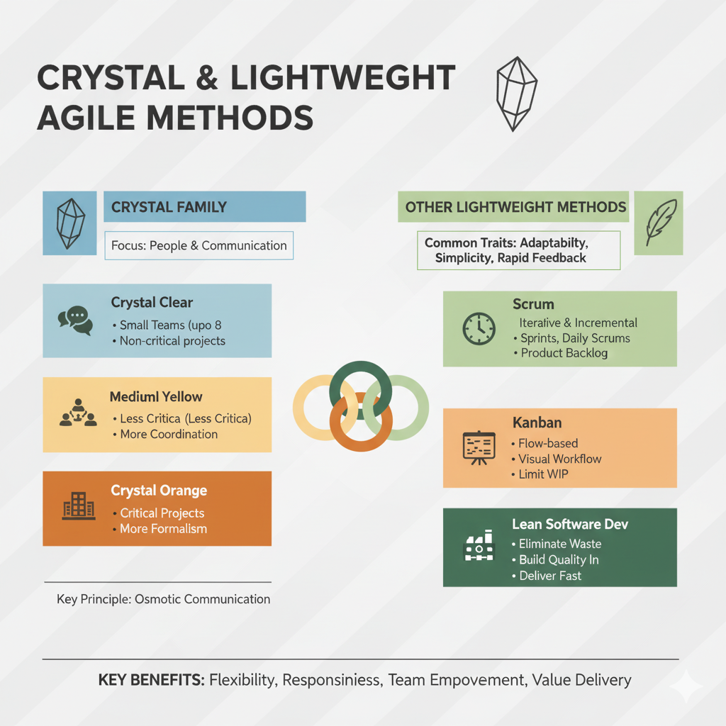 Crystal is part of a broader category of lightweight Agile methods. These methods aim to reduce bureaucracy and provide just enough process to keep teams aligned. Examples include Adaptive Software Development, which emphasizes cycles of speculation, collaboration, and learning. Another is Lean Software Development, which applies lean manufacturing principles like eliminating waste and amplifying learning. These approaches share the idea that agility comes from simplicity and adaptability, not heavy structures.