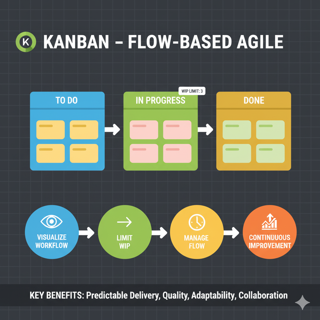 Kanban is highly flexible. It works well for teams that cannot plan work in fixed sprints or where priorities shift quickly. By visualizing all work, it becomes clear where tasks get stuck and where improvements are needed. Limiting work in progress improves focus and quality, because the team finishes more items instead of juggling too many at once. Over time, measuring flow leads to better predictability of how much work can be delivered, which helps stakeholders plan with confidence.