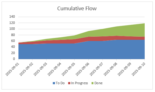- A steady climb in Done with stable WIP bands usually indicates a healthy, predictable flow.
