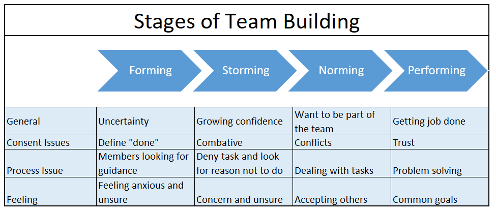 The first stage is Forming, when the team is just coming together. People tend to be polite and cautious while they try to understand roles and responsibilities. Conflict is limited, and trust is still low. Clear direction, explicit expectations, and help interpreting the project’s goals are especially useful at this stage, as they reduce ambiguity and establish a shared starting point for the work.