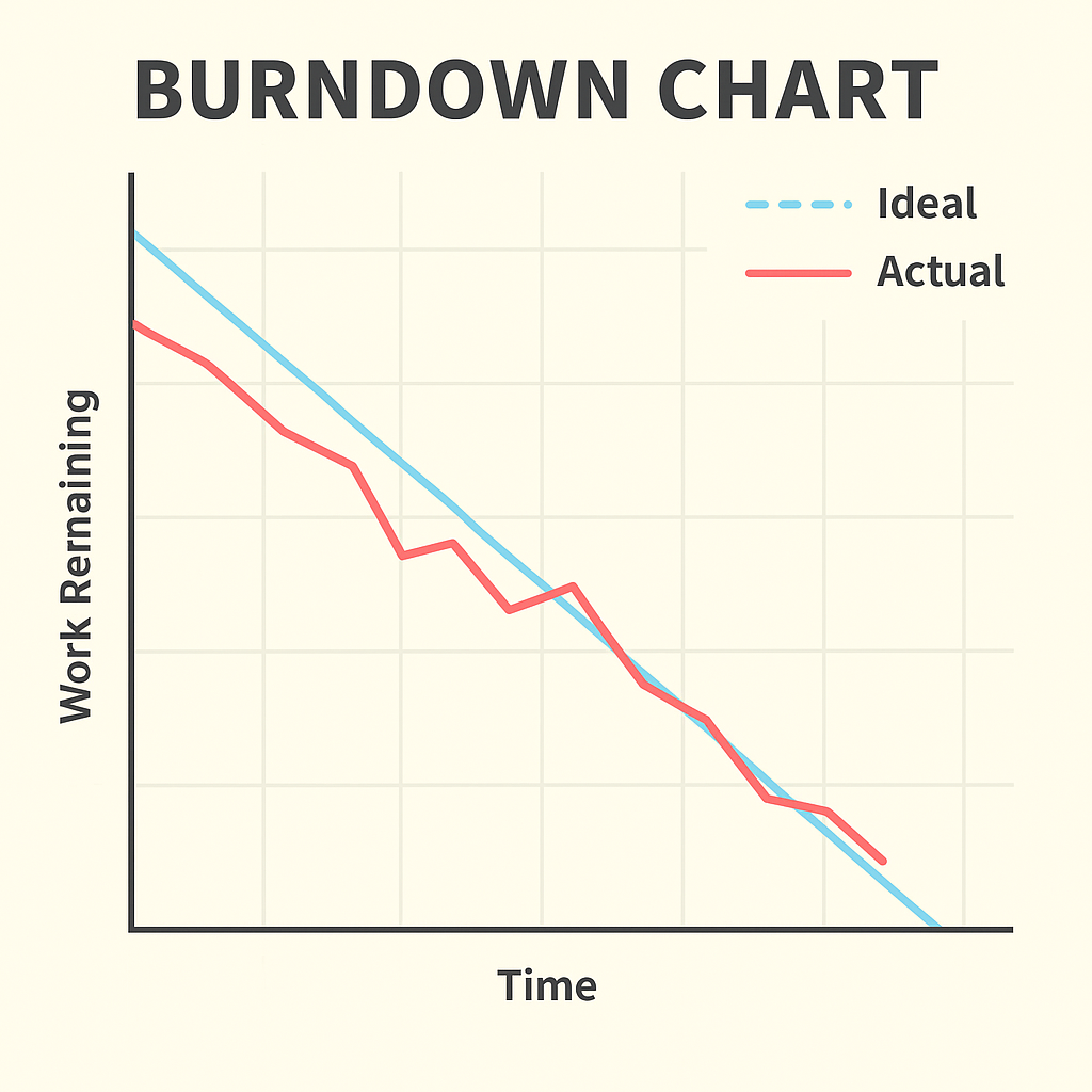 A burndown chart shows how much work remains in a sprint or release. The vertical axis represents story points or tasks. The horizontal axis represents time. Each day, the team plots how many points remain. Ideally, the line slopes steadily downward toward zero. If the line is flat, progress has stalled. If the line rises, scope has increased. Burndown charts are simple, quick to update, and easy for anyone to understand.