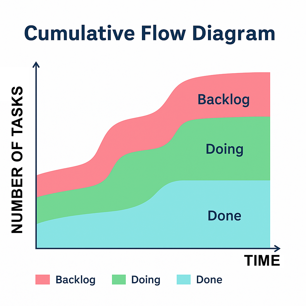 Cumulative flow diagrams, or CFDs, are powerful tools for understanding flow. A CFD shows work items in different states, such as to do, in progress, and done. Each state is represented as a colored band stacked over time. If the “in progress” band grows wider, it signals a bottleneck. If the “done” band grows steadily, the team is delivering value consistently. CFDs are particularly useful in Kanban and flow-based systems, but Scrum teams can benefit from them too.