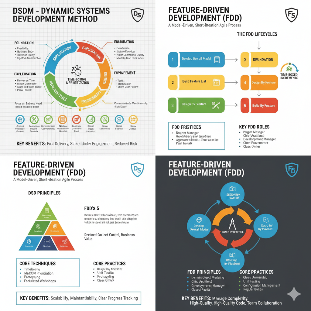 Both DSDM and FDD sought to solve challenges of their time—DSDM by balancing agility with governance, and FDD by organizing large, design-heavy projects around features. They share Agile principles like delivering value frequently and involving users, but they approach them with more structure than many modern Agile methods. Today, elements of DSDM and FDD often appear inside hybrid frameworks or scaled Agile environments, even if the full methods are less commonly adopted.