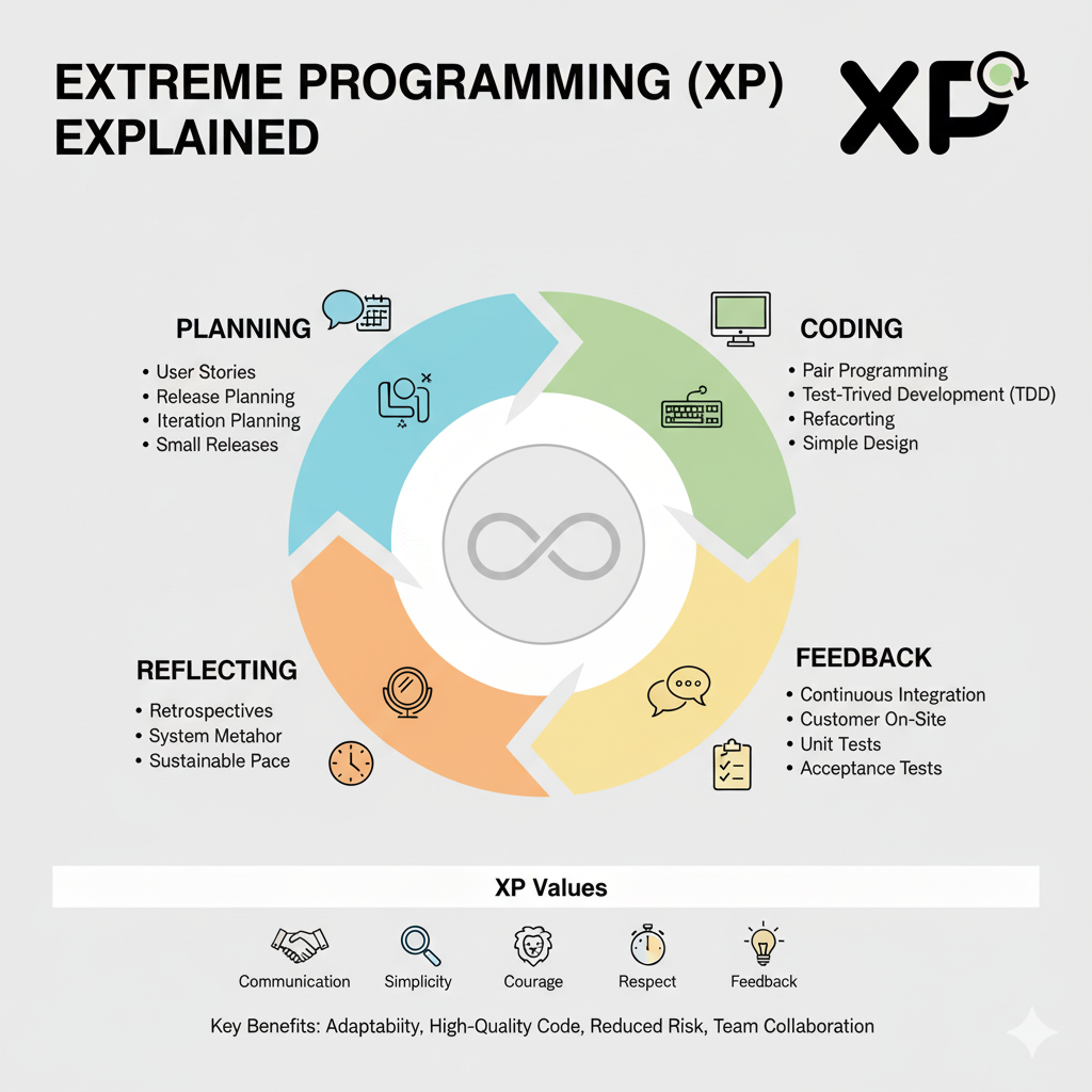 Extreme Programming, or XP, is one of the earliest Agile methods, developed in the 1990s. While Scrum focuses on project management and collaboration, XP emphasizes the technical side of software development. It provides concrete engineering practices that help teams build high-quality code quickly and adapt to changing requirements with confidence. Many Agile teams use Scrum for structure and XP for engineering discipline, combining the best of both worlds.